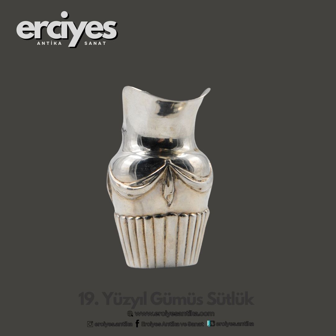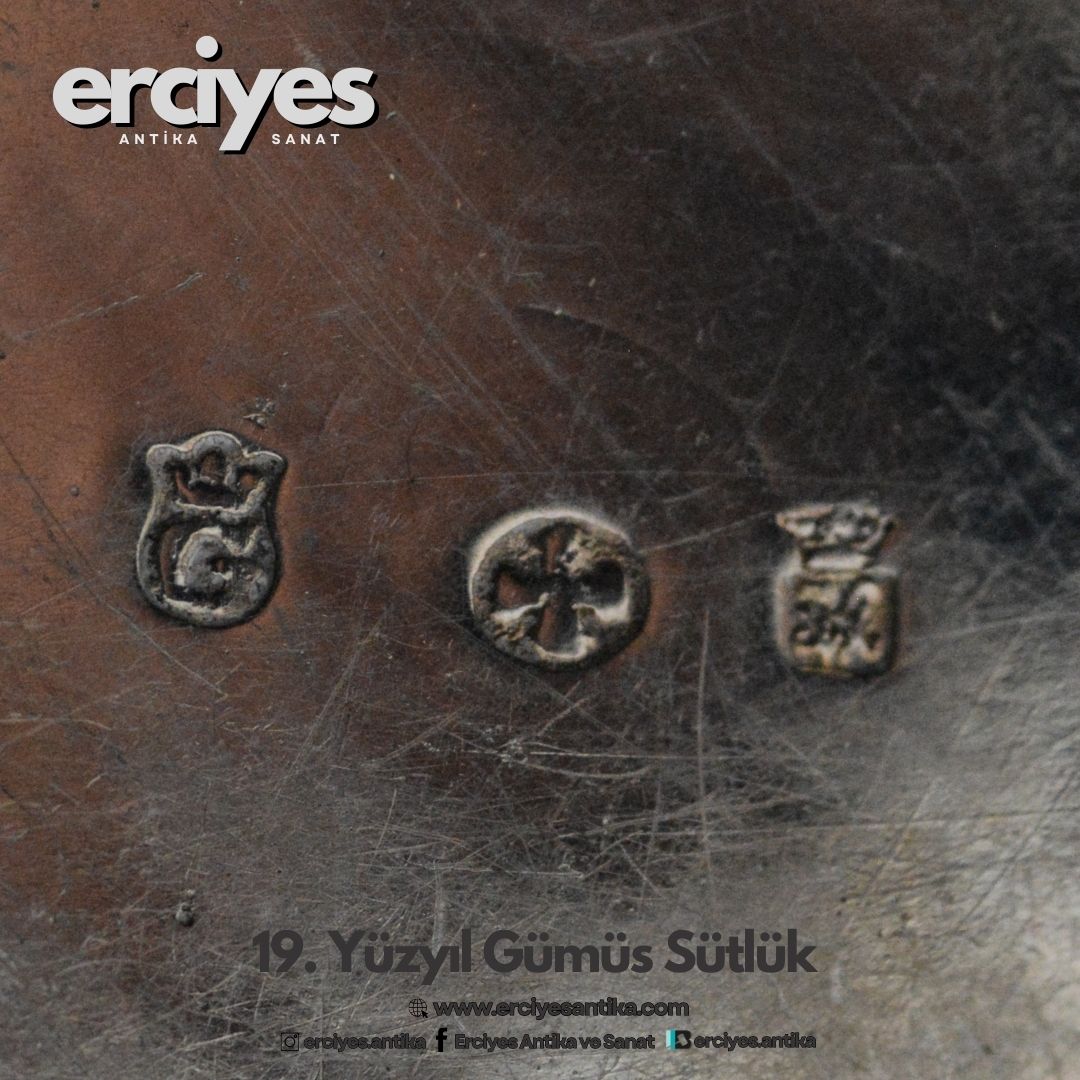 19. yüzyıl antika gümüş sütlük, zarafetin ve ustalığın simgesidir. İnce işçilikle şekillendirilmiş, her detayıyla dönemin estetik anlayışını yansıtan bu sütlük, zamanın ötesinden gelen bir sofistike güzellik taşır. Gümüşün parıltısı, ustaların elinden çıkan detaylı kabartmalar ve zarif kulpu, bu parçada geçmişin izlerini hissettirirken, her kullanımda bir tarihi deneyim sunar. Hem işlevsel hem de koleksiyonluk değeri olan bu antika gümüş sütlük, 19. yüzyılın zarif sofra kültürünü ve el sanatlarını günümüze taşır.