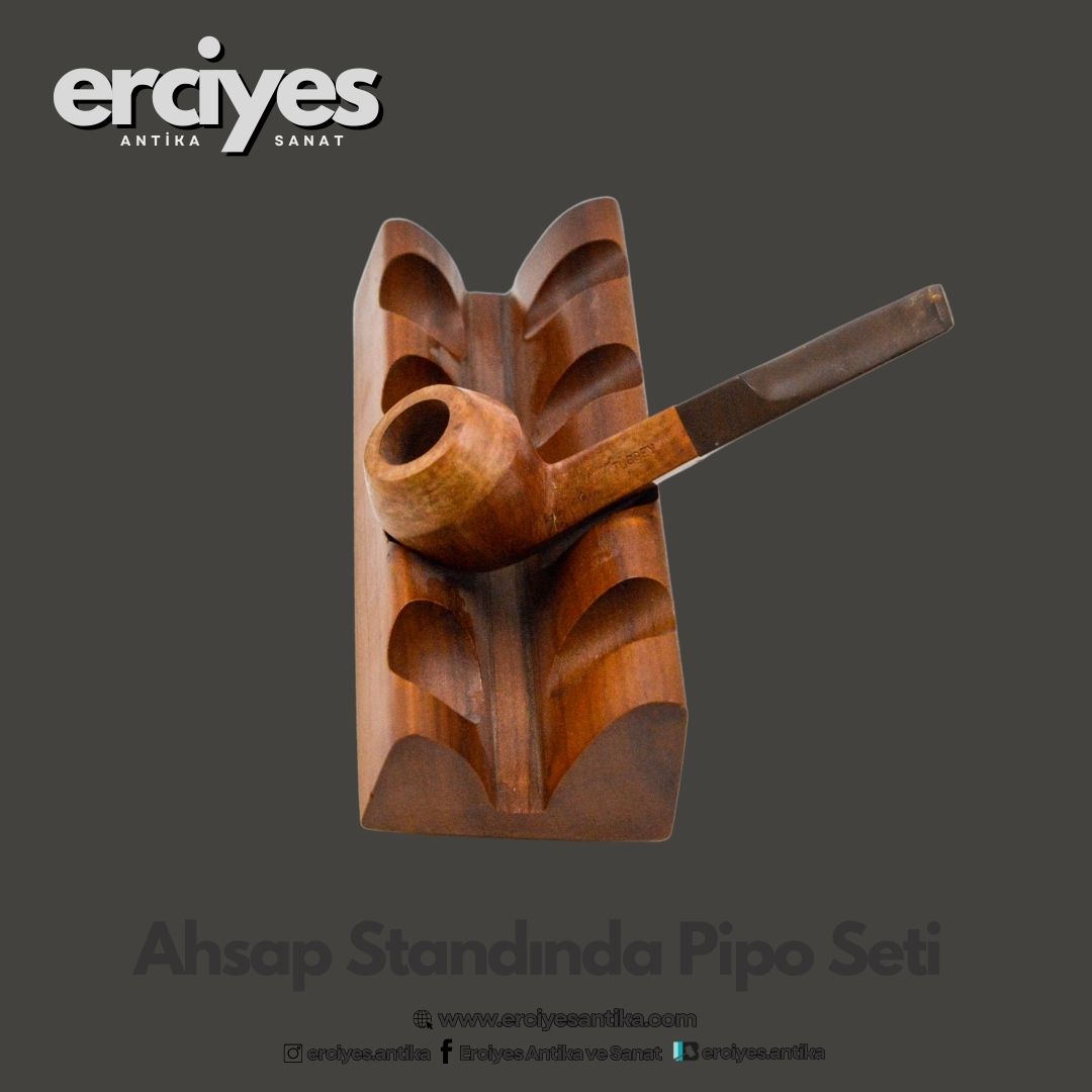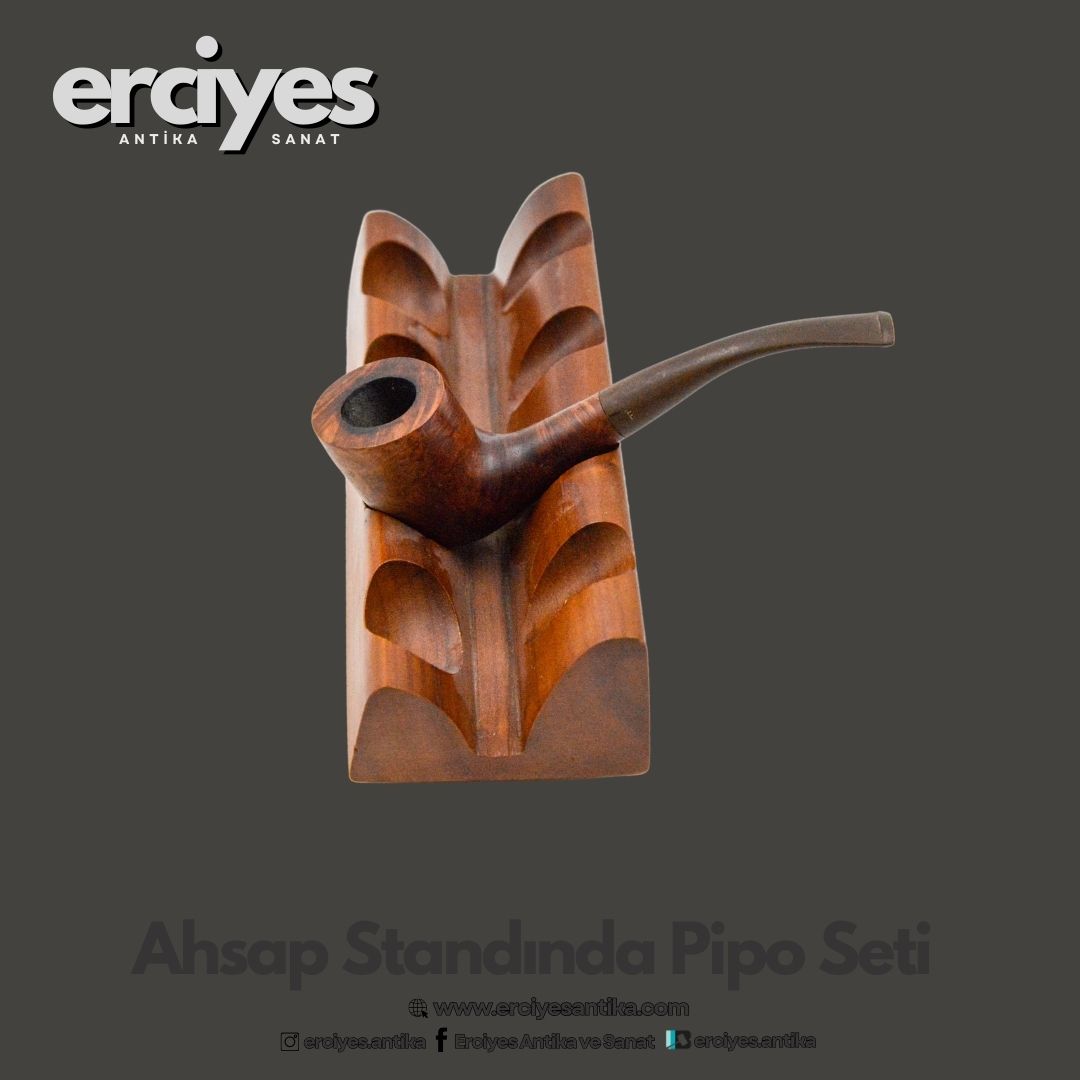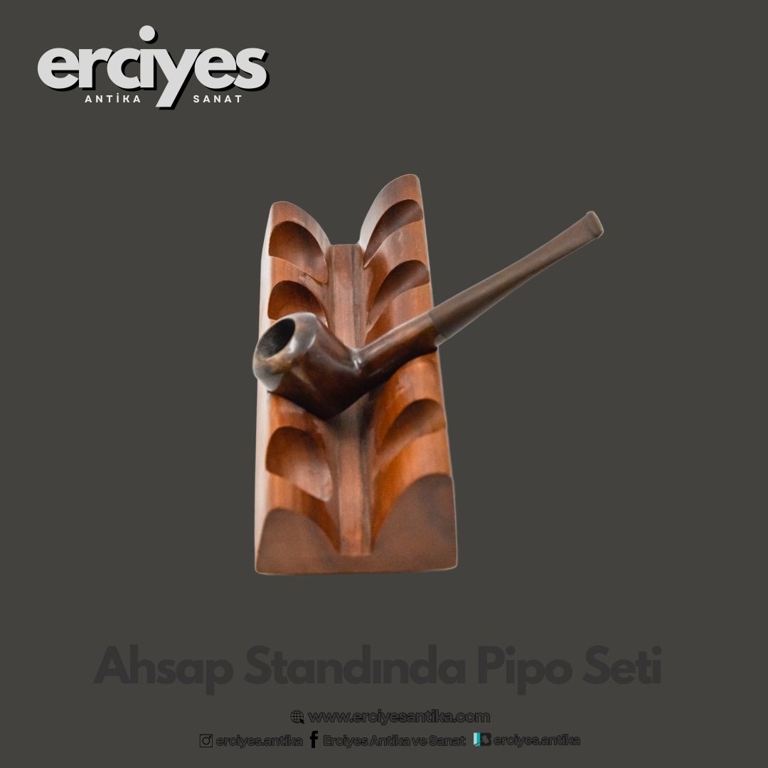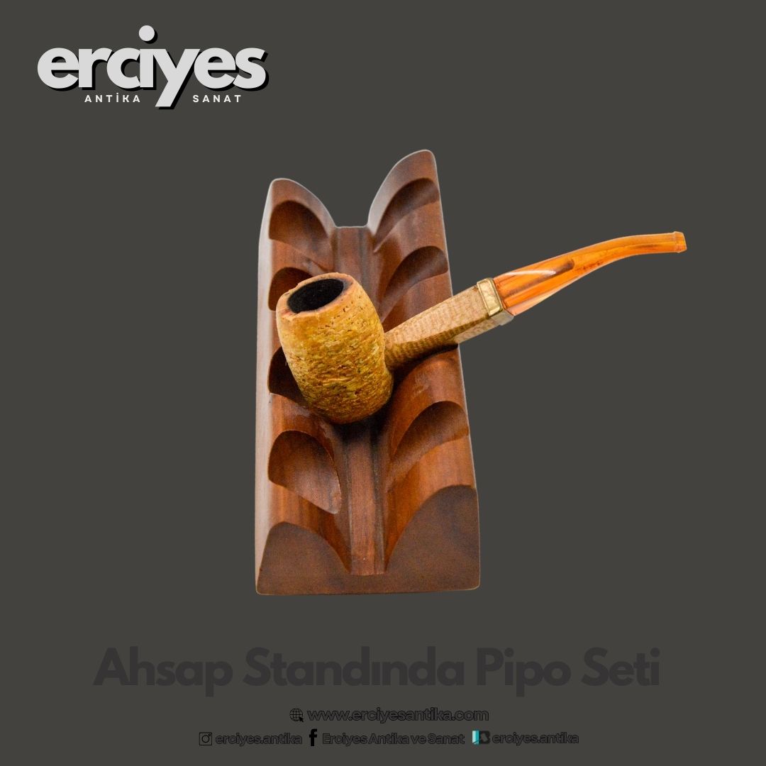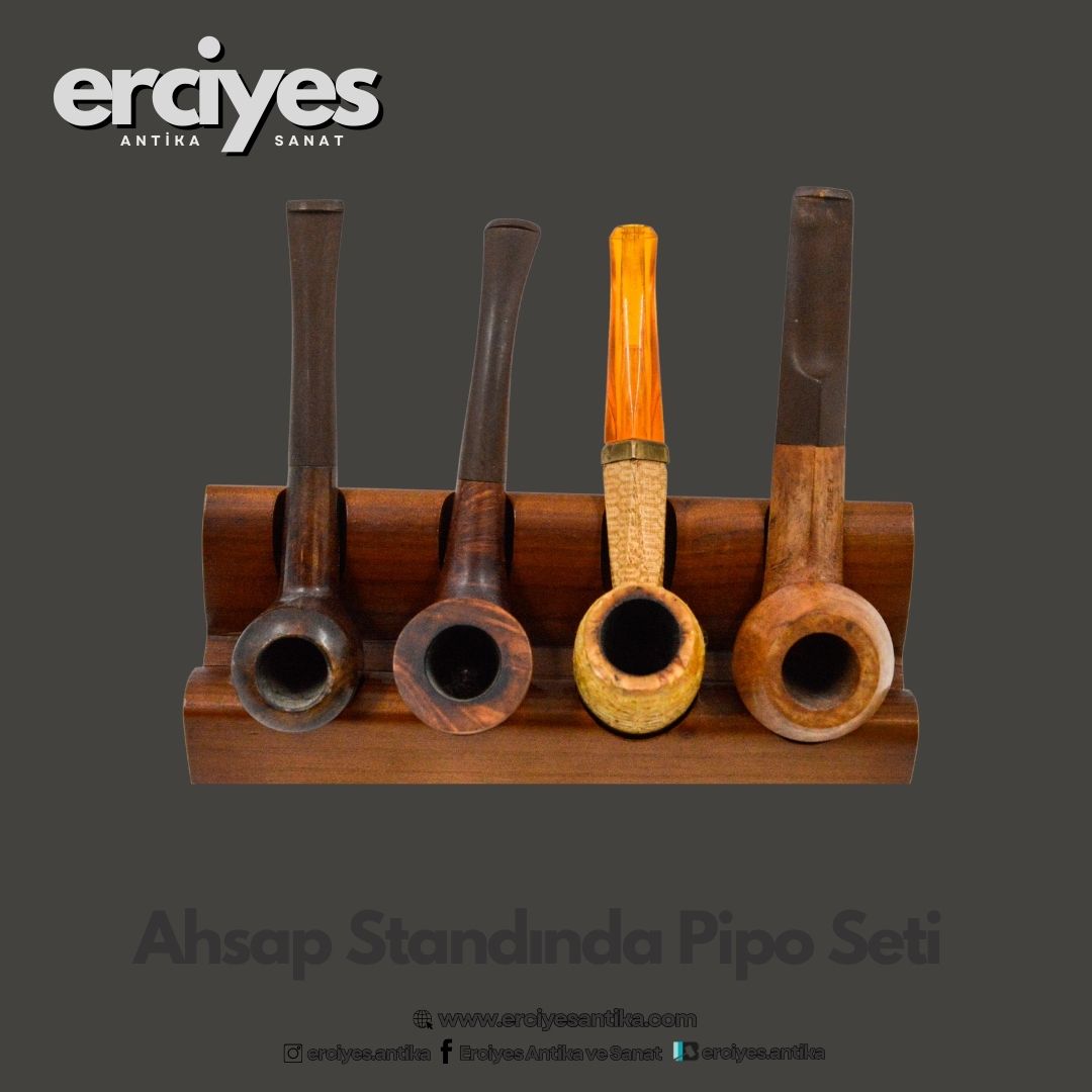 Ahşap stant üzerinde sergilenen bu ağaçtan oyma pipolar, el işçiliğinin zarif bir örneğidir. Her biri özenle işlenmiş, doğal dokusu ve detaylı oyma desenleriyle göz kamaştıran bu pipolar, zamanla şekil almış ustaların yeteneğini yansıtır. Ahşabın sıcak tonları, her bir parçanın özgünlüğünü vurgularken, geleneksel bir estetikle modern bir zarafeti bir araya getirir. Hem koleksiyonluk bir değer taşıyan hem de kullanımda olan bu pipolar, geçmişin ve el sanatlarının eşsiz bir buluşmasıdır. Ahşap stant, bu özel parçaları sergileyerek onları adeta birer sanat eseri gibi sunar.