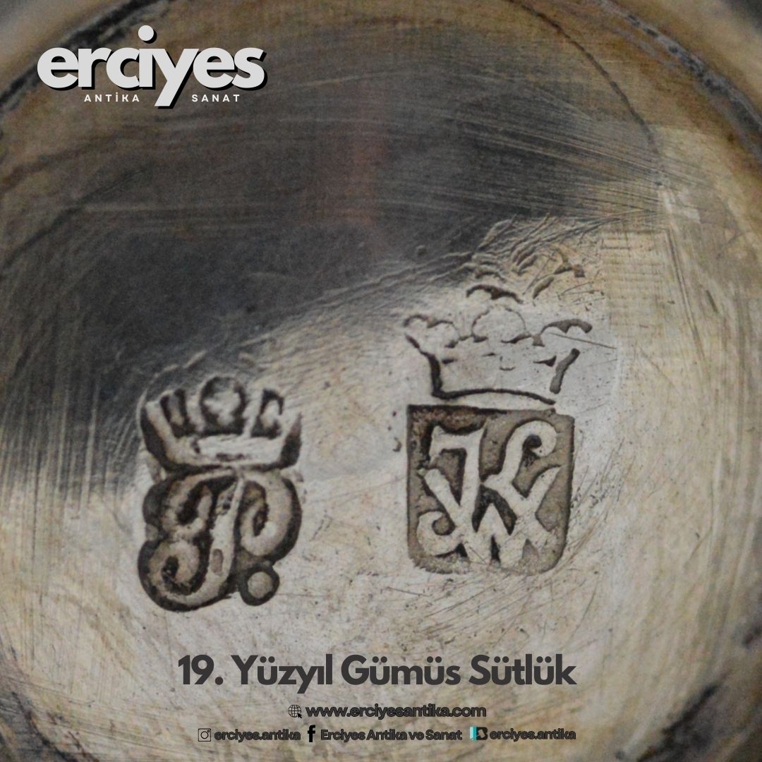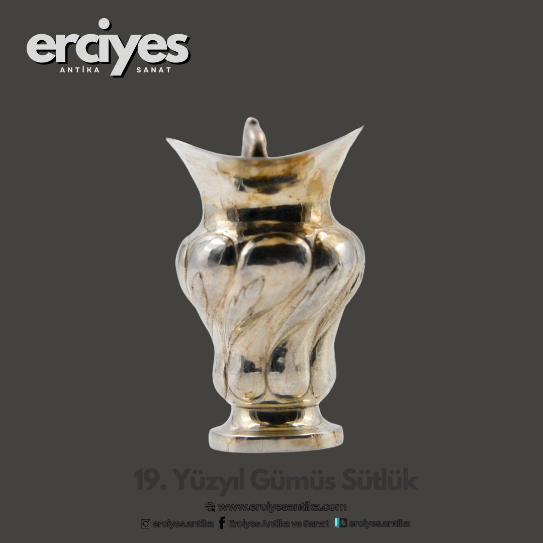 19. yüzyıl antika gümüş sütlük, zarafetin ve ustalığın simgesidir. İnce işçilikle şekillendirilmiş, her detayıyla dönemin estetik anlayışını yansıtan bu sütlük, zamanın ötesinden gelen bir sofistike güzellik taşır. Gümüşün parıltısı, ustaların elinden çıkan detaylı kabartmalar ve zarif kulpu, bu parçada geçmişin izlerini hissettirirken, her kullanımda bir tarihi deneyim sunar. Hem işlevsel hem de koleksiyonluk değeri olan bu antika gümüş sütlük, 19. yüzyılın zarif sofra kültürünü ve el sanatlarını günümüze taşır.