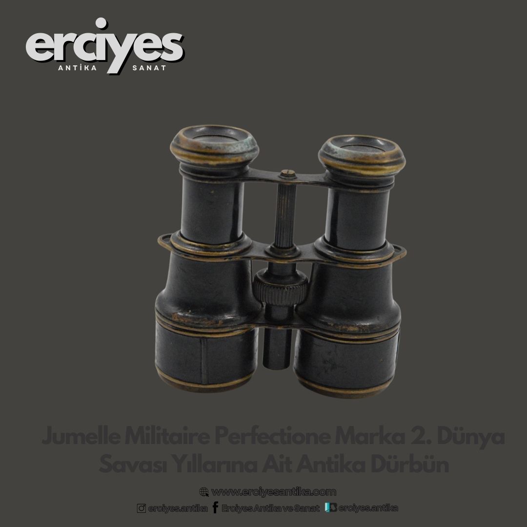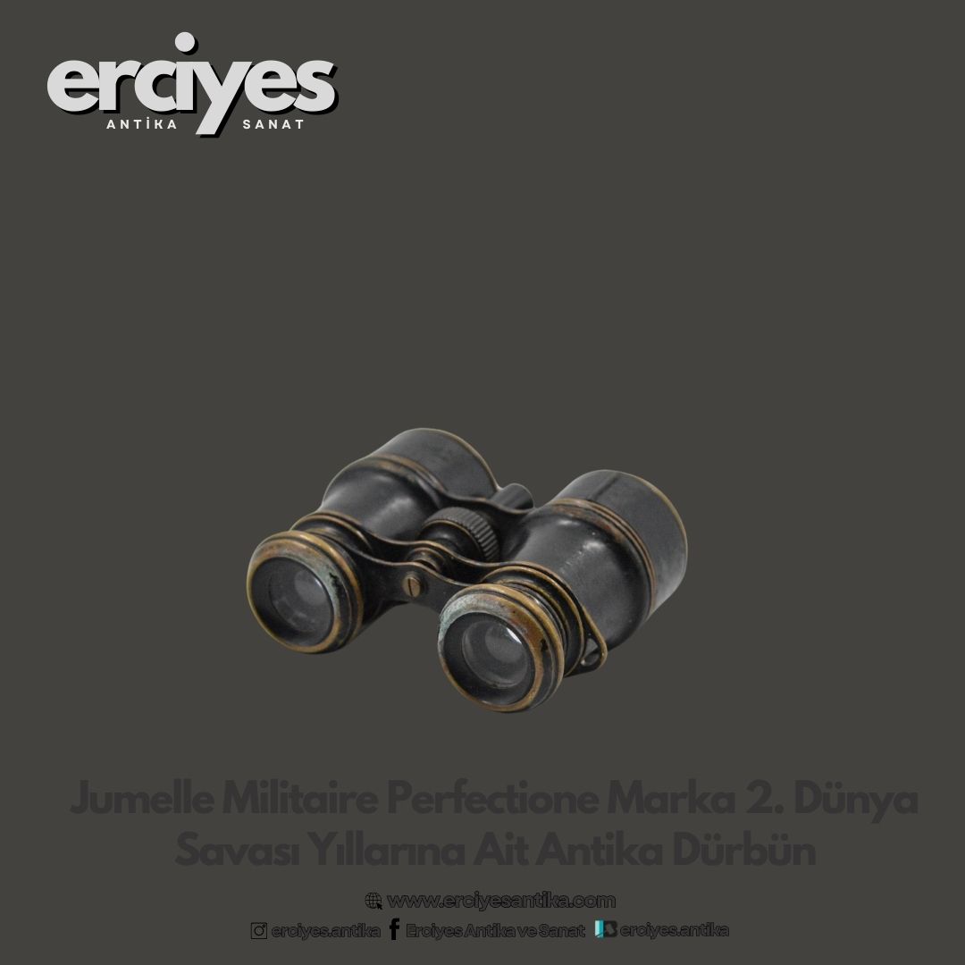 İkinci Dünya Savaşı yıllarına ait bu Jumelle Militaire Perfectione marka dürbün, savaşın zorlu koşullarında askerler için kritik gözlem ve keşif aracı olarak kullanılmış nadir bir koleksiyon parçasıdır. Bu dürbün, dönemin yüksek kaliteli askeri ekipmanlarından biri olup, mükemmel optik performansı ve sağlam yapısıyla dikkat çeker.